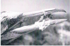 Cet oiseau a voulu manger un crabe qui était emmêlé dans un filet. L’oiseau aussi a été emmêlé. Il ne peut plus ouvrir ou fermer le bec et manger.Yaël, Mattéo,Axel, Loeïza