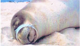 Le phoque a été piégé dans un tuyau. Il n’arrivera plus à manger car il ne peut pas se débrouiller tout seul pour enlever l’anneau.Leyna, robin
