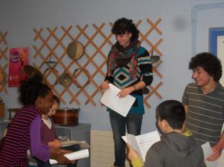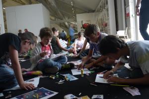 A la fin de la visite, nous avons fait un atelier. Nous étions assis par groupes de quatre sur de grands tapis. On nous a distribué des magazines, des ciseaux, des crayons de couleurs, de la colle et une feuille blanche.