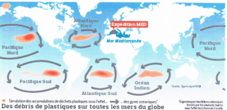 Sur cette carte on voit les 5 grandes zones de déchets plastiques dans les océans.